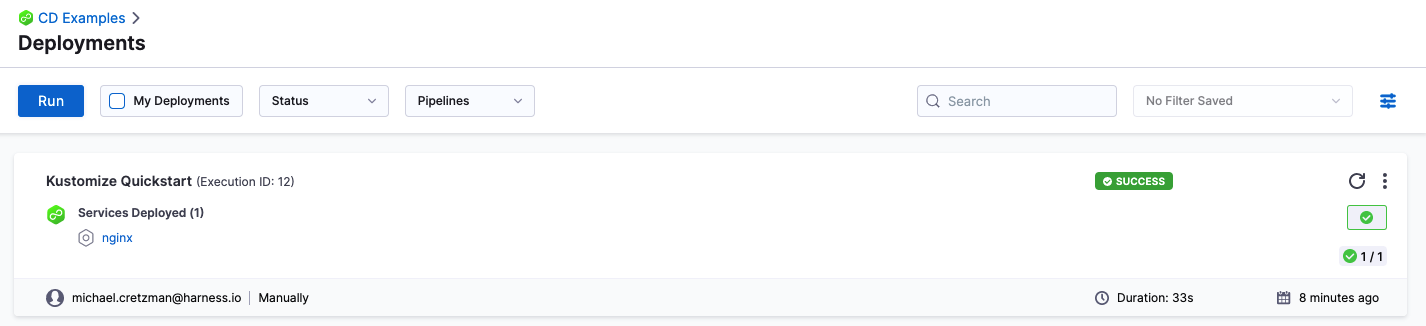 - Run the new Kustomize pipeline and deploy an NGINX Docker image to your target cluster.