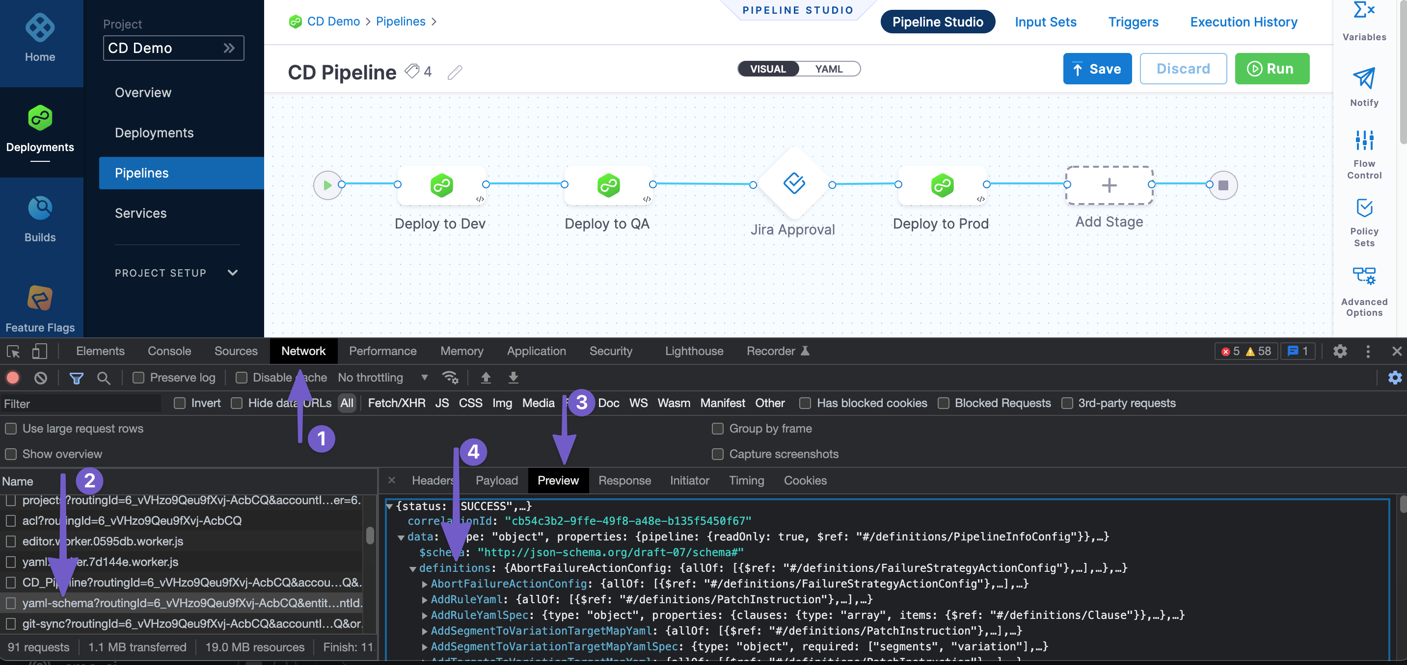 In addition to the YAML schema available at github.com/harness/harness-schema, you can use Chrome DevTools to view the schema.