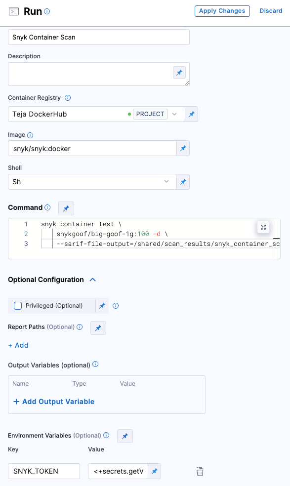 1. In Optional Configuration, under Environment Variables, add a variable to access your Snyk API key: