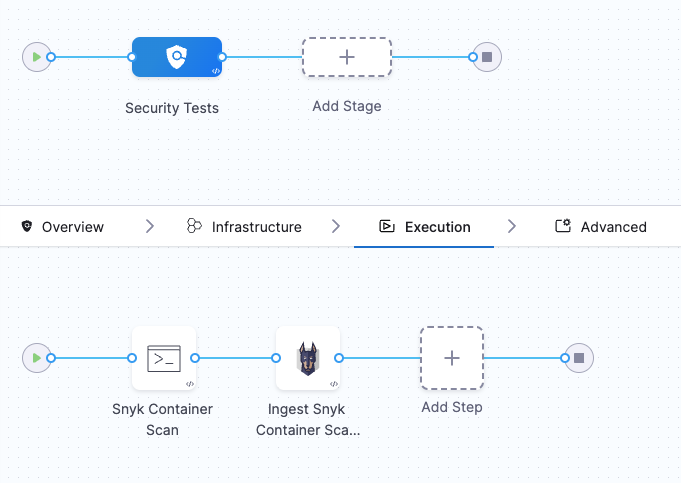 In the Ingestion scan mode, the Snyk step reads data from a file, normalizes it, and deduplicates it. To perform a Snyk Container scan using the Ingestion scan mode, we will use two steps:
