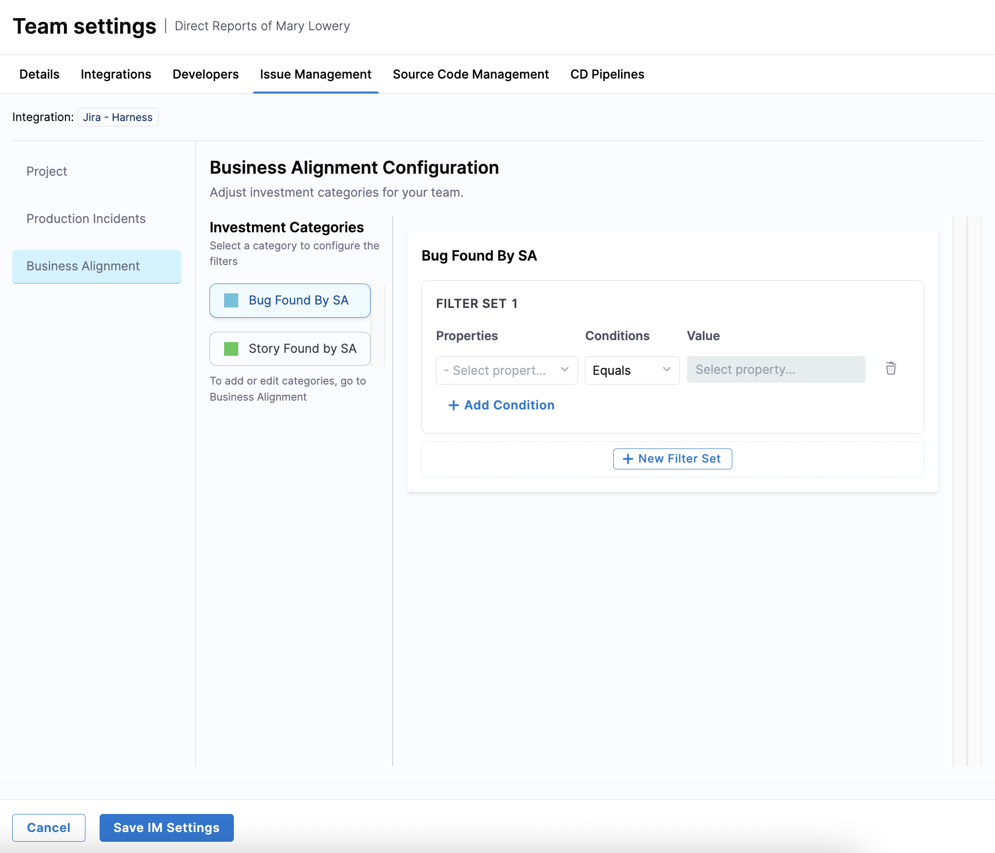 Create a filter set to define investment categories on the Business Alignment tab.