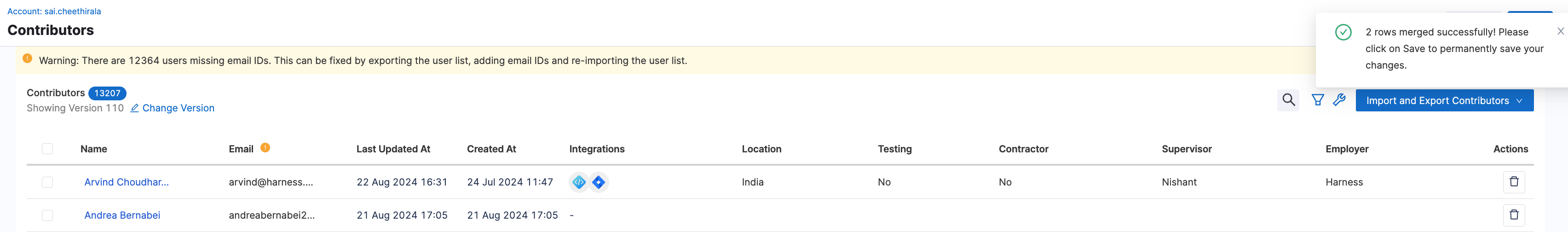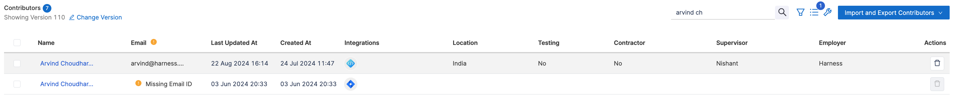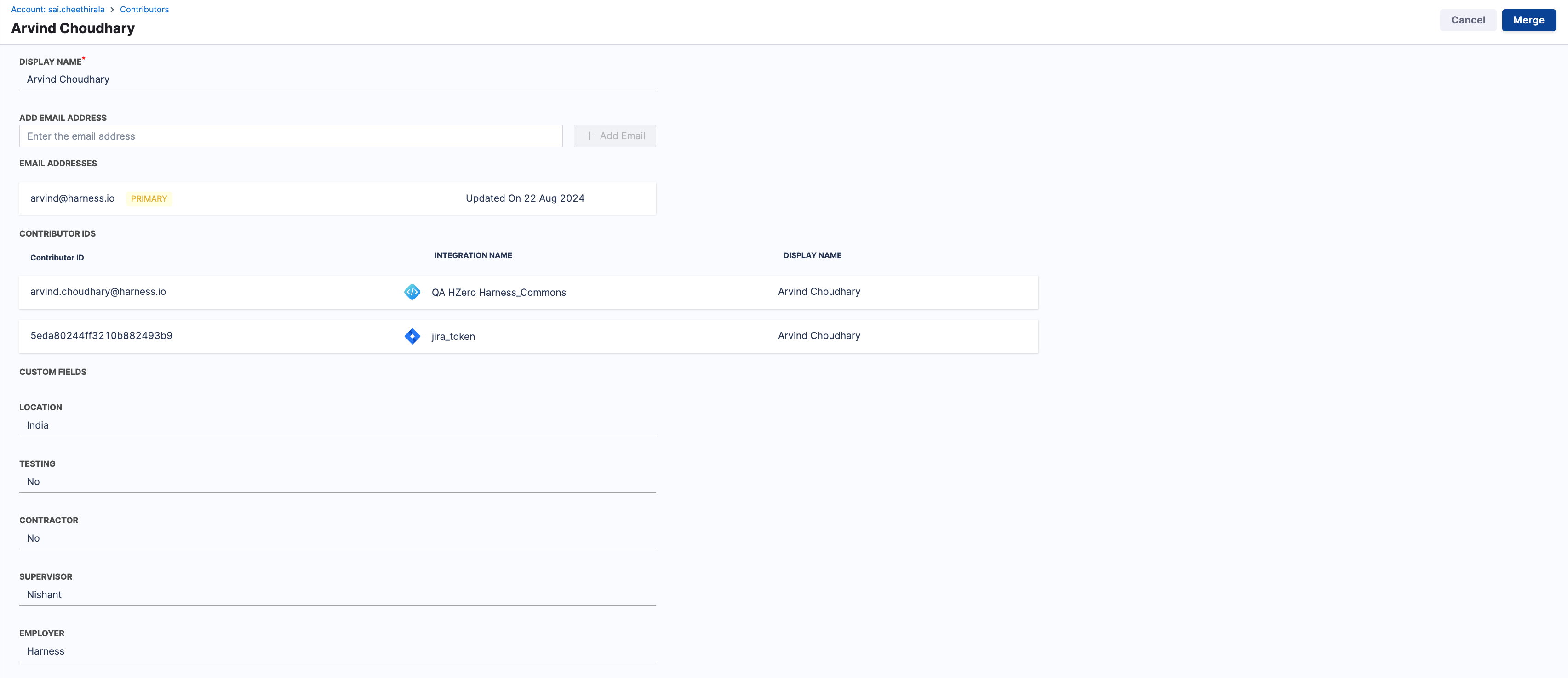 1. Identify the duplicate contributor profiles. For example: A contributor with the Harness Code integration and an associated email and the same contributor with the Jira integration but without an associated email.